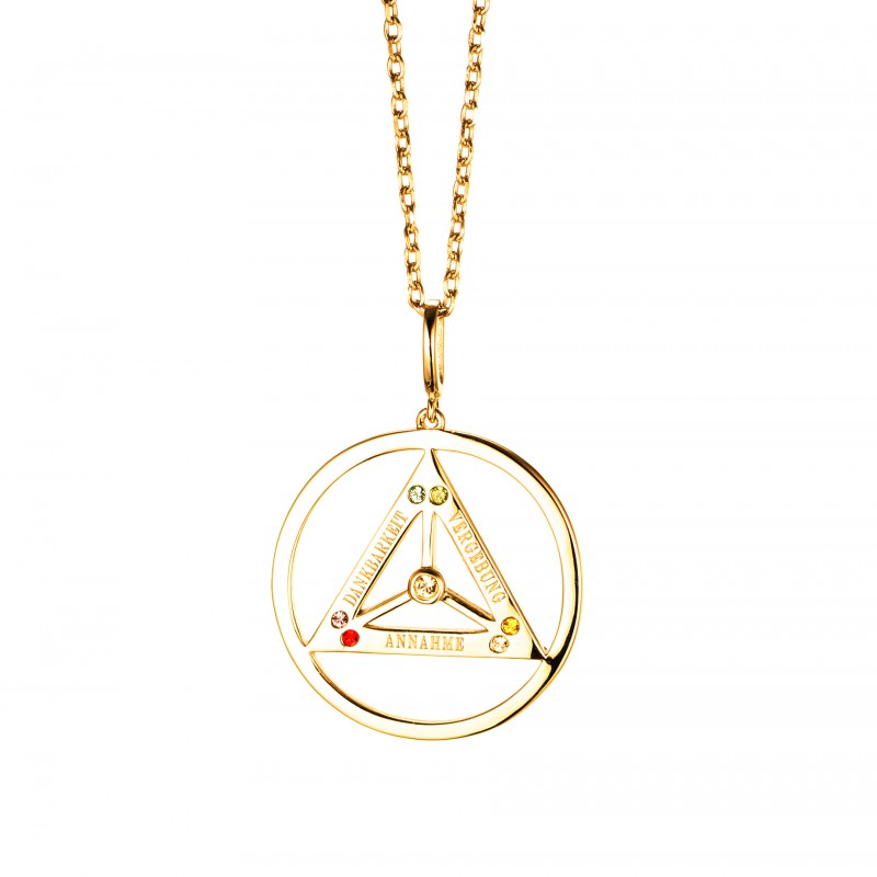 Die Kettenanhänger gibt es in Form eines Dreieckes oder eines Viereckes. Beide Varianten wirken durch die Kraft der Information, durch das eingravierte Wort und die eingelassenen Edelsteine, die wiederum die Urelemente verkörpern.
